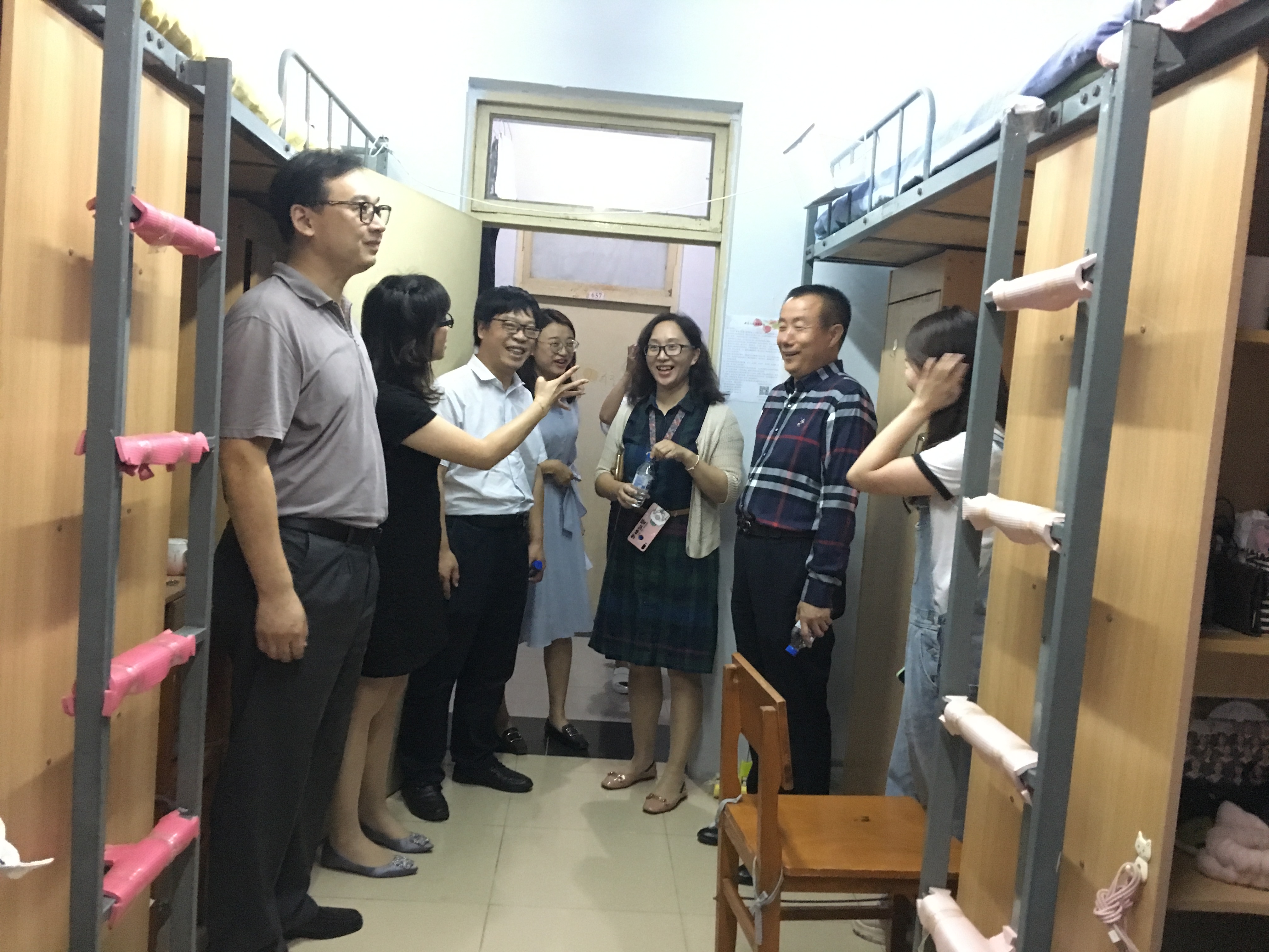 党委书记霍志刚,院长吴宏政,副院长石瑛,副院长李长龙,党委副书记、纪委书记崔妍,团委书记万佳悦来到中心校区学生宿舍亲切看望新生并了解新生住宿和生活情况。