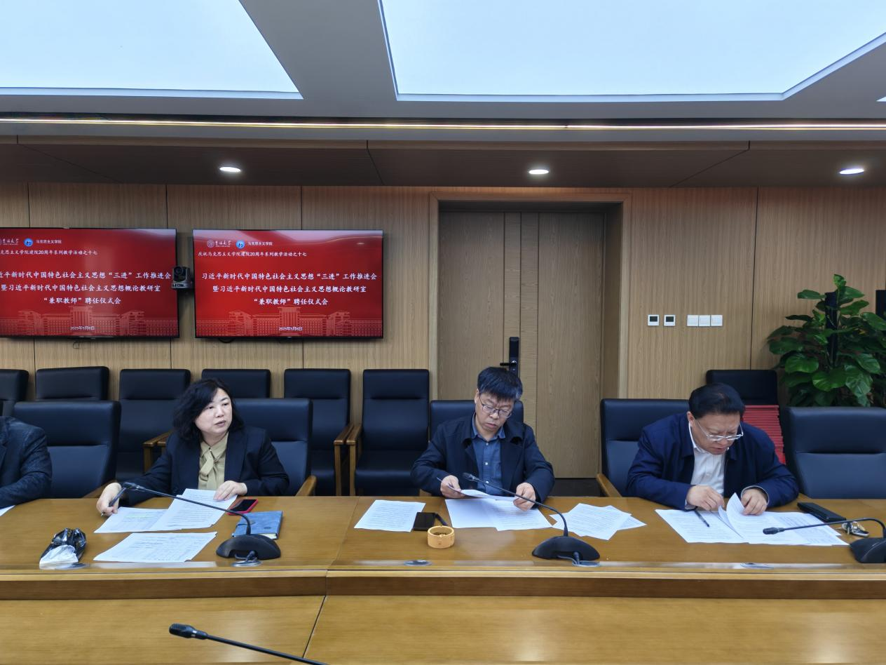 在吕振羽楼324会议室召开习近平新时代中国特色社会主义思想“三进”工作推进会暨习近平新时代中国特色社会主义思想概论教研室“兼职教师”聘任仪式。学院党委书记钟新、院长吴宏政、副院长纪明、李静及各教研室主任、副主任出席会议,共谋思政课高质量发展新路径,会议由副院长李静主持。